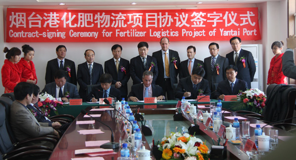 烟台港化肥物流项目签字暨奠基仪式于2010年11月8日在烟台市举行,我司作为项目投资方之一应邀出席,朱联副总经理及运输物流部韩绍忠经理代表我司出席了该仪式。出席仪式的还有烟台市市领导,烟台海关、边检、交通局、港航局等相关单位领导,以及其他投资方代表。 烟台港化肥物流项目是由我公司与烟台港、运安公司、中海油、嘉禾农资共同投资兴建的国内首个专业级国际化肥物流基地,总投资3.5亿元人民币,项目将依托烟台港的区位优势,资源优势和服务优势,发挥各股东方的合力,打造中国最大的化肥进出口物流平台;烟台港化肥物流项目的建设和运营将大幅提高烟台港进出口化肥的中转能力,使烟台港成为国内第一个拥有进出口化肥专业码头的国际化口岸,同时,也将进一步提升我国在国际化肥贸易领域的市场地位,增强我国在国际化肥行业的影响力,具有显著的经济效益和深远的战略意义。